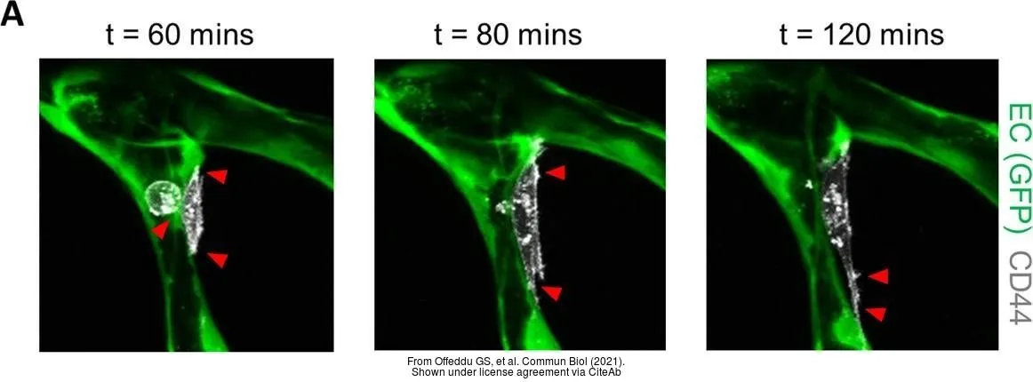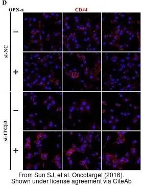 CD44 is an 82kDa multifunctional transmembrane glycoprotein involved in cell migration, proliferation, differentiation, and signaling pathways that mediate cell survival. It is involved in many malignancies as well as being recognized as a cancer stem cell marker. Importantly, it is expressed in leukocytes and is a marker of leukemia-initiating cells, being found to be critical in the pathogenesis of T cell acute lymphoblastic leukemia.