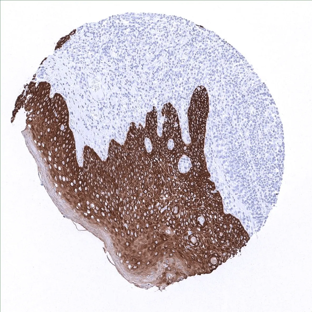 Squamous epithelium of the tonsil surface shows strong cytokeratin 5 immunostaining of all cell layers.