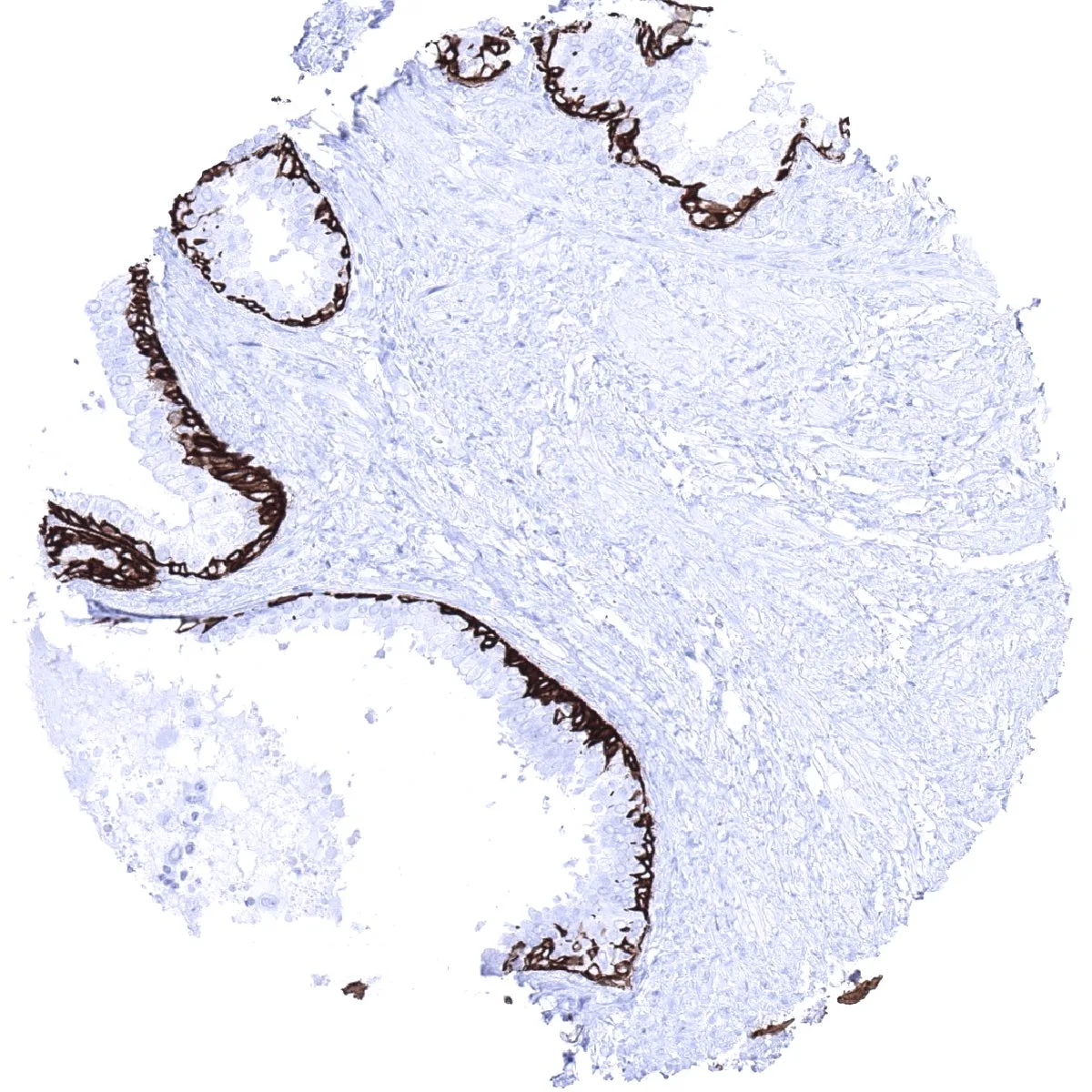 Basal cells of the prostatic glands show strong cytokeratin 5 immunostaining.