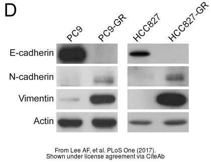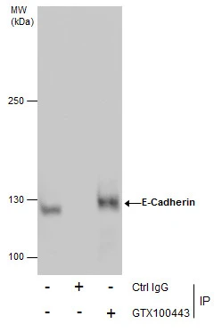 E-cadherin antibody immunoprecipitates E-cadherin protein in IP experiments.