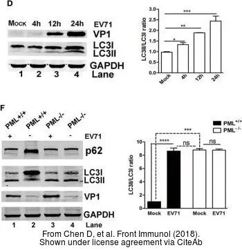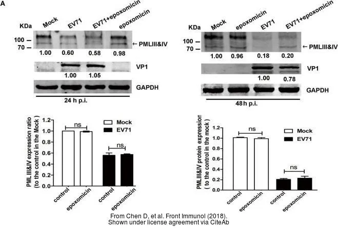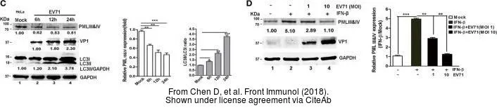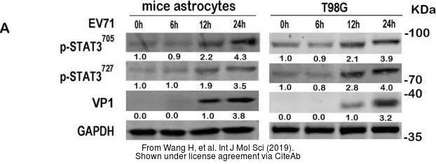 Non-infected (–) and infected RD whole cell extracts (30 μg) were separated by 12% SDS-PAGE, and the membrane was blotted with Enterovirus 71 VP1 antibody (GTX132338) diluted at 1:5000. The HRP-conjugated anti-rabbit IgG antibody (GTX213110-01) was used to detect the primary antibody.