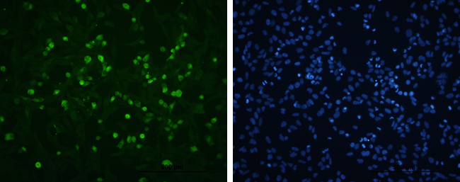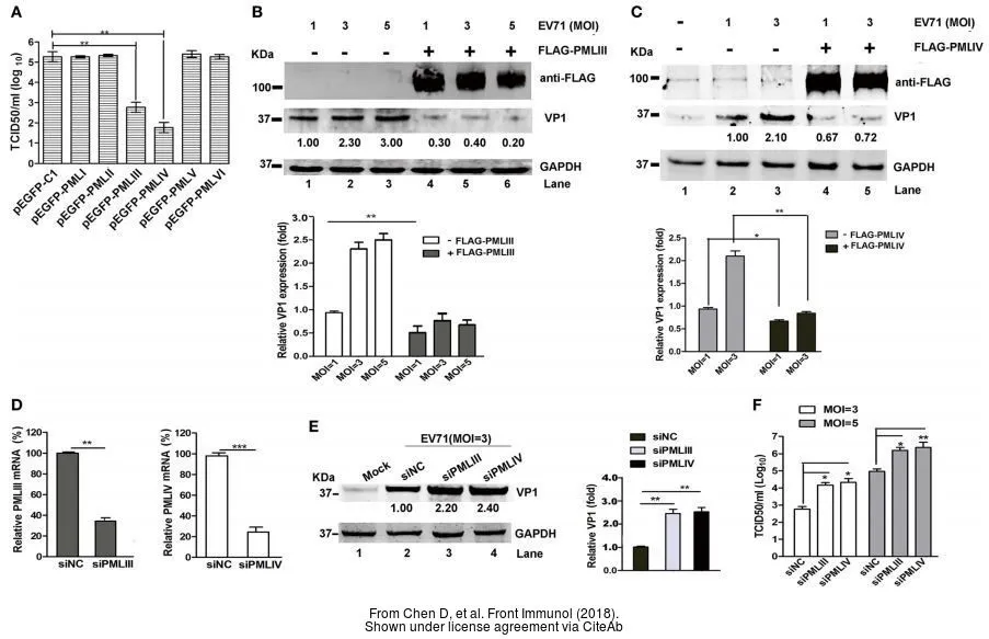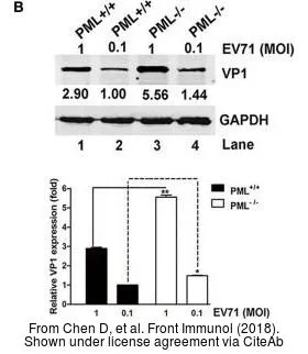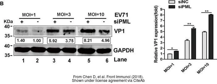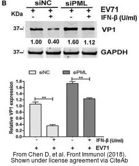 Non-transfected (–) and transfected (+) 293T whole cell extracts (30 μg) were separated by 12% SDS-PAGE, and the membrane was blotted with Enterovirus 71 VP1 antibody (GTX132338) diluted at 1:5000. The HRP-conjugated anti-rabbit IgG antibody (GTX213110-01) was used to detect the primary antibody.