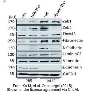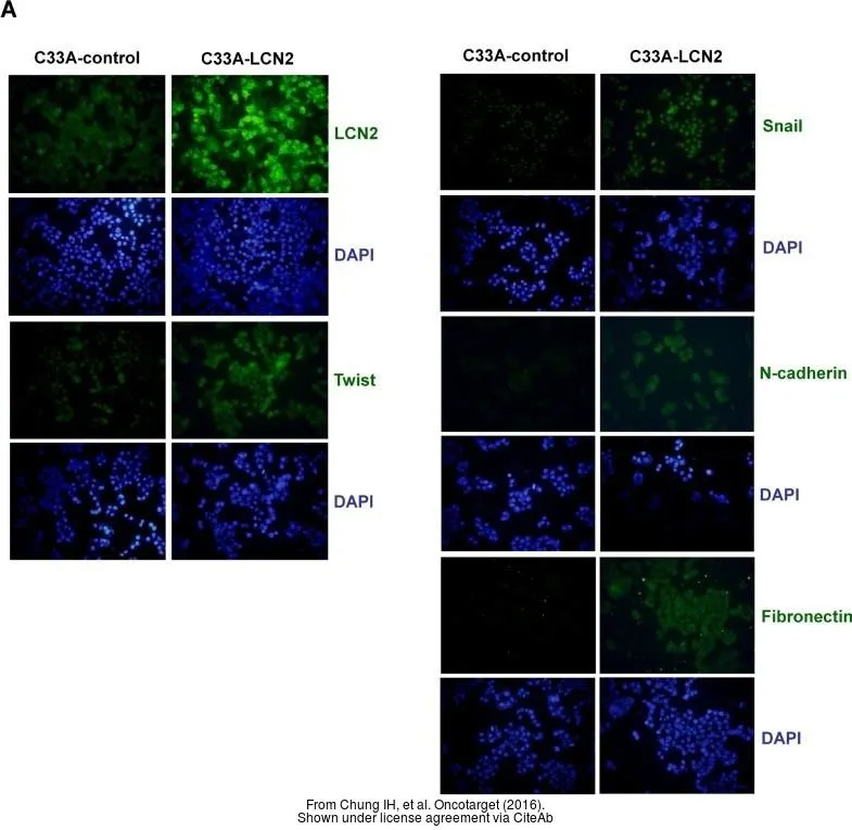 Untreated (–) and treated (+) HepG2 whole cell extracts (30 μg) were separated by 5% SDS-PAGE, and the membrane was blotted with Fibronectin antibody [N1N2], N-term (GTX112794) diluted at 1:1000. The HRP-conjugated anti-rabbit IgG antibody (GTX213110-01) was used to detect the primary antibody.