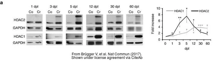 Wild-type (WT) and HDAC1 knockout (KO) HeLa cell extracts (30 μg) were separated by 10% SDS-PAGE, and the membrane was blotted with HDAC1 antibody (GTX100513) diluted at 1:500. The HRP-conjugated anti-rabbit IgG antibody (GTX213110-01) was used to detect the primary antibody.