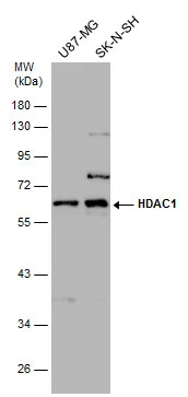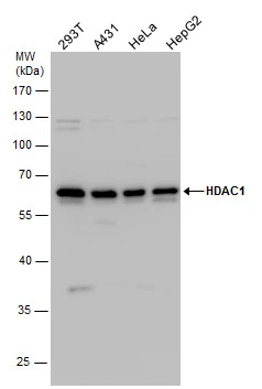 HDAC1 antibody detects HDAC1 protein by western blot analysis. Various whole cell extracts (30 μg) were separated by 10% SDS-PAGE, and the membrane was blotted with HDAC1 antibody (GTX100513) diluted by 1:1000. The HRP-conjugated anti-rabbit IgG antibody (GTX213110-01) was used to detect the primary antibody.