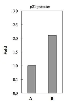 HDAC1 antibody immunoprecipitates HDAC1 protein-DNA in ChIP experiments. ChIP Sample: 293T whole cell lysate/extract A. 5 μg preimmune rabbit IgG B. 5 μg of HDAC1 antibody (GTX100513) The precipitated DNA was detected by PCR with primer set targeting to p21 promoter.