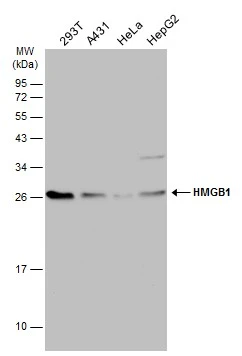 Anti-HMGB1 antibody used in Western Blot (WB). GTX101277