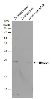 HMGB1 antibody detects Hmgb1 protein on whole mount zebrafish by immunohistochemical analysis.