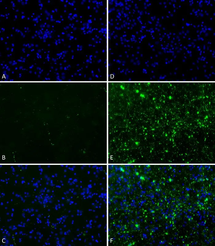 Primary rat hippocampal neurons show lewy body inclusion formation when treated with active Alpha Synuclein Protein Preformed Fibrils (GTX17669-pro) at 4 μg/ml (D-F), but not when treated with control Alpha Synuclein Protein Preformed Fibrils (GTX17667-pro) at 4 μg/ml (A-C).