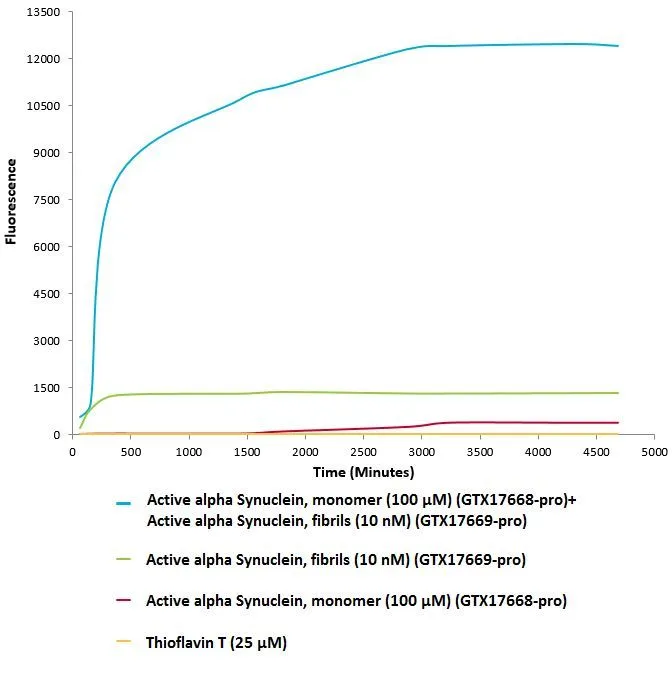 Active alpha synuclein preformed fibrils (GTX17669-pro) seed the formation of new alpha synuclein fibrils from the pool of alpha synuclein monomers (GTX17668-pro). Thioflavin T is a fluorescent dye that binds to beta sheet-rich structures, such as those in alpha synuclein fibrils. Upon binding, the emission spectrum of the dye experiences a red-shift, and increased fluorescence intensity. Thioflavin T emission curves show increased fluorescence (correlated to alpha synuclein protein aggregation) over time when 10 nM of active alpha synuclein preformed fibrils (GTX17669-pro) is combined with 100 μM of alpha synuclein monomer (GTX17668-pro), as compared to active alpha synuclein preformed fibrils (GTX17669-pro) alone and alpha synuclein monomer (GTX17668-pro) alone. Thioflavin T ex = 450 nm, em = 485 nm.