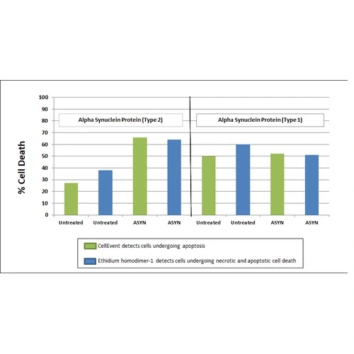 Toxicity results comparing active Human alpha Synuclein protein (Pre-Formed Fibrils) (GTX17667-pro) and active Alpha Synuclein Protein Preformed Fibrils (GTX17669-pro). Data was graphed after live cell imaging results were obtained using the following procedure: After 8 days in vitro, primary rat mixed cortical neuron cells were treated with 500 μg/ml of Type 1 and Type 2 Alpha Synuclein Proteins for 20 hours at 37˚C.