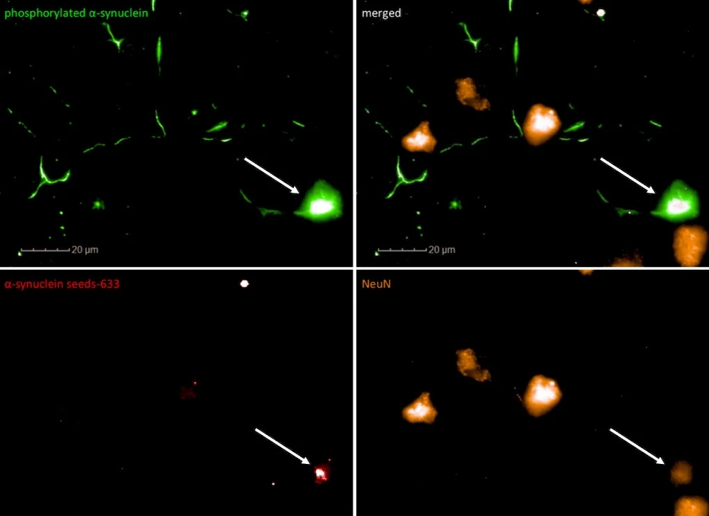 Right : Alpha synuclein seeds within the soma and neurites of mouse neurocortical primary cells after 24 hours.
