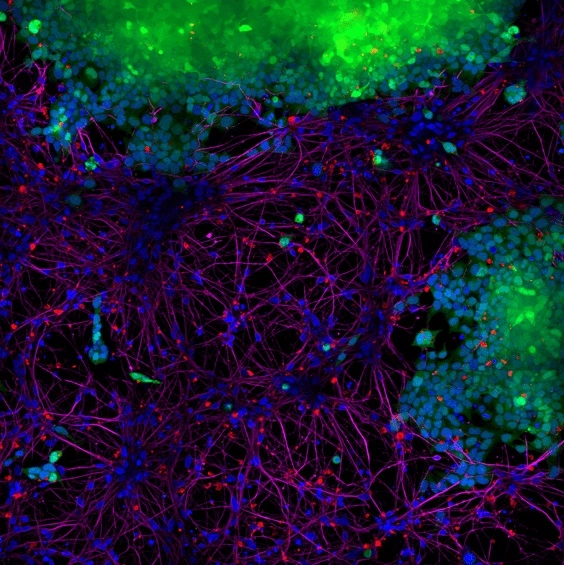 Left : Neurites filled with fluorescently-labelled alpha synuclein seeds in a microfluidic co-culture system after 24 hours.