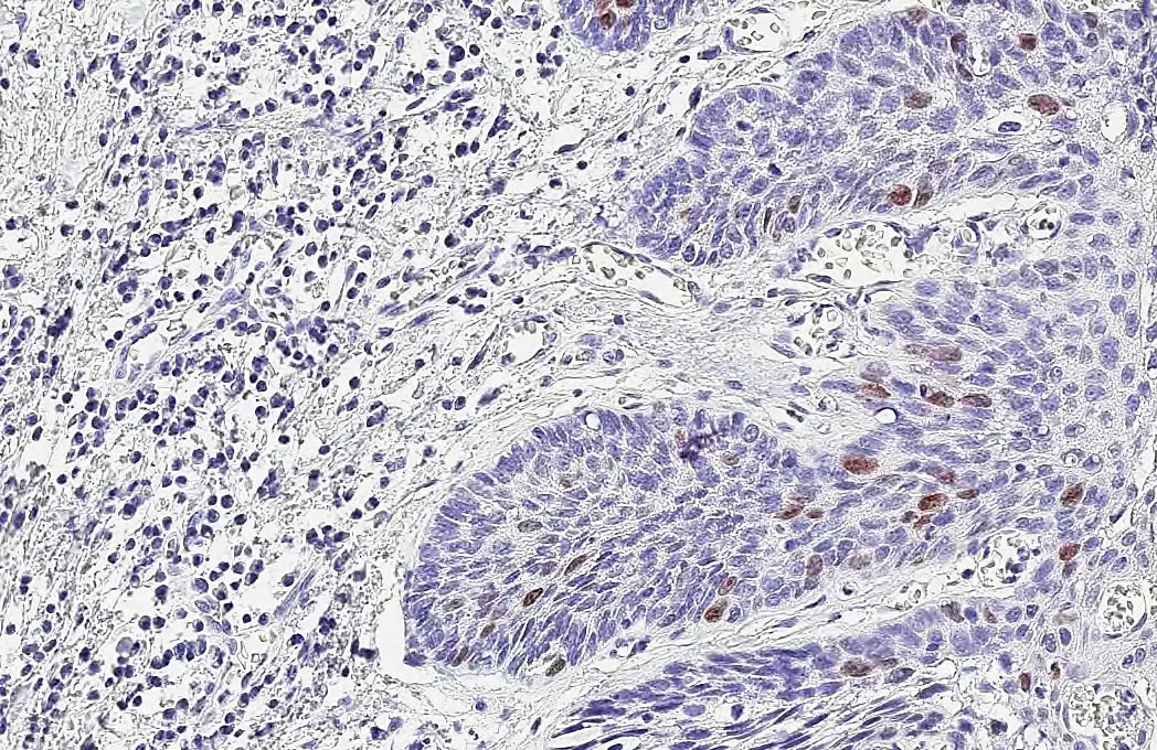 Ki67 antibody [SP6] detects Ki67 protein at nucleus in human cervical metaplasia (left) and carcinoma (right) by immunohistochemical analysis.