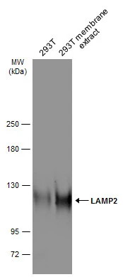 LAMP2 antibody detects lysosome-associated membrane protein 2 (LAMP-2, or CD107b), a transmembrane glycoprotein that generally migrates at ~120 kDa on western blot. LAMP-2 has a similar distribution to LAMP-1 in endolysosomal and autophagic organelles. Moreover, like LAMP-1, LAMP-2 has been used to study lysosome biology.