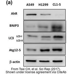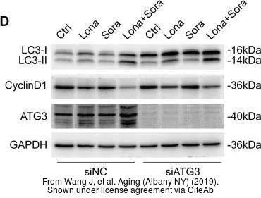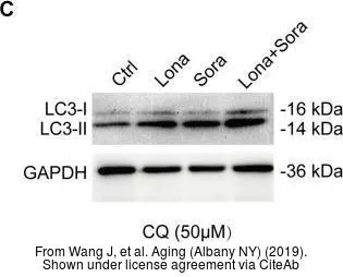 Untreated (–) and treated (+) HepG2 whole cell extracts (30 μg) were separated by 15% SDS-PAGE, and the membranes were blotted with LC3B antibody (GTX127375) diluted at 1:1000 and competitor's antibody (# Highly Cited Antibody ) diluted at 1:1000. The HRP-conjugated anti-rabbit IgG antibody (GTX213110-01) was used to detect the primary antibody.