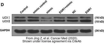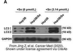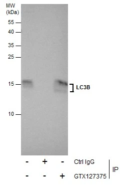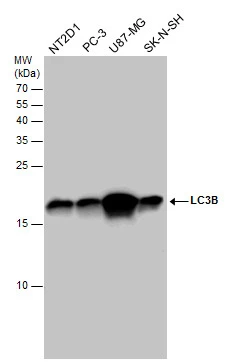 LC3B antibody detects MAP1LC3B protein by western blot analysis.