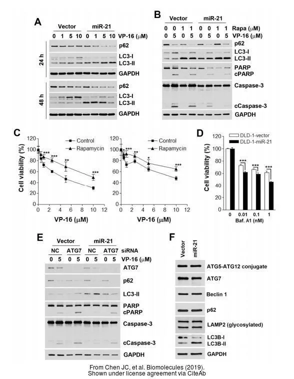 Untreated (–) and treated (+) HeLa whole cell extracts (30 μg) were separated by 15% SDS-PAGE, and the membrane was blotted with LC3B antibody (GTX127375) diluted at 1:2500. The HRP-conjugated anti-rabbit IgG antibody (GTX213110-01) was used to detect the primary antibody.