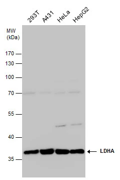 LDHA facilitates glycolytic flux by converting pyruvate to lactate and NADH to NAD+. It is primarily cytoplasmic, but is also found in mitochondria and the nucleus. In addition to its metabolic function, LDHA is also a single‐stranded DNA‐binding protein participating in DNA duplication and transcription. Elevated expression of LDHA is observed in various cancers.