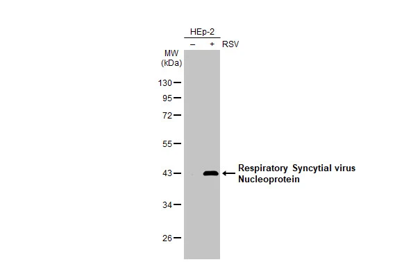Non-infected (–) and infected (+) HEp-2 whole cell extracts were separated by 10% SDS-PAGE, and the membrane was blotted with Respiratory Syncytial virus Nucleoprotein antibody [HL1246] (GTX636648) diluted at 1:1000. The HRP-conjugated anti-rabbit IgG antibody (GTX213110-01) was used to detect the primary antibody.