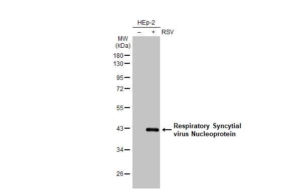 Non-infected (–) and infected (+) HEp-2 whole cell extracts (5 μg) were separated by 10% SDS-PAGE, and the membrane was blotted with Respiratory Syncytial virus Nucleoprotein antibody [HL1247] (GTX636649) diluted at 1:25000. The HRP-conjugated anti-rabbit IgG antibody (GTX213110-01) was used to detect the primary antibody.