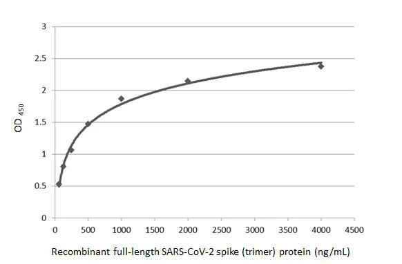 Sandwich ELISA detection of recombinant full-length SARS-CoV-2 spike (trimer) protein using GTX632604 as capture antibody at concentration of 5 μg/mL and GTX635672 as detection antibody at concentration of 1 μg/mL. Rabbit IgG antibody (HRP) (GTX213110-01) was diluted at 1:10000 and used to detect the primary antibody.