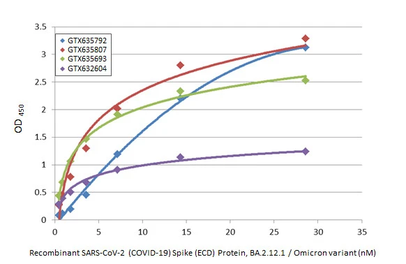 Indirect ELISA analysis was performed by coating the plate with recombinant SARS-CoV-2 (COVID-19) Spike (ECD) Protein, Omicron / BA.2.12.1 variant, His tag (GTX137114-pro) (28.62-0.45 nM). Coated protein was probed with the specified SARS-CoV-2 (COVID-19) Spike antibodies (1 μg/mL). Goat anti-rabbit IgG antibody (HRP) (GTX213110-01) (1:10000) or goat anti-mouse IgG antibody (HRP) (GTX213111-01) (1:10000) were used to detect the bound primary antibodies.