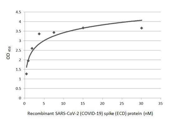 Indirect ELISA analysis was performed by coating plate with 50 μL of recombinant SARS-CoV-2 (COVID-19) spike S2 ECD protein at concentrations ranging from 0.0625 μg/mL to 4 μg/mL. The coated protein is detected with SARS-CoV / SARS-CoV-2 (COVID-19) spike antibody [1A9] (GTX632604) at 1 μg/mL. Mouse IgG antibody (HRP) (GTX213111-01) was diluted at 1:10000 and used to detect the primary antibody.
