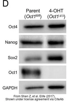 Whole cell extract (30 μg) was separated by 12% SDS-PAGE, and the membranes were blotted with SOX2 antibody [N1C3] (GTX101507) diluted at 1:10000 and competitor's antibody (sc-17320) diluted at 1:1000. The HRP-conjugated anti-rabbit IgG antibody (GTX213110-01) was used to detect the primary antibody.