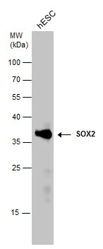 SOX2 antibody detects SOX2 protein by western blot analysis. Mouse ESC lysate (50 μg) was separated by 10% SDS-PAGE, and the membrane was blotted with SOX2 antibody (GTX101507) at a dilution of 1:2500. The HRP-conjugated anti-rabbit IgG antibody (GTX213110-01) was used to detect the primary antibody.