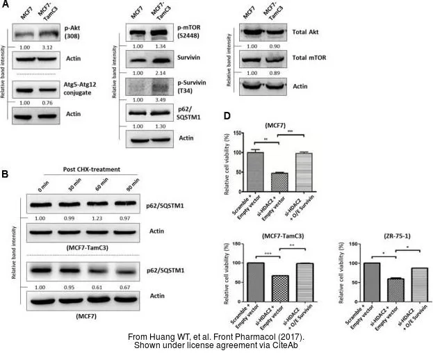 Untreated (–) and treated (+) Huh-7 whole cell extracts (30 μg) were separated by 10% SDS-PAGE, and the membrane was blotted with SQSTM1 antibody [N3C1], Internal (GTX100685) diluted at 1:1000. The HRP-conjugated anti-rabbit IgG antibody (GTX213110-01) was used to detect the primary antibody.