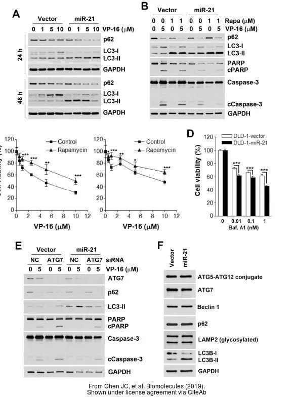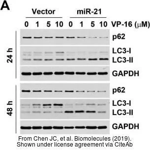Untreated (–) and treated (+) HepG2 whole cell extracts (30 μg) were separated by 10% SDS-PAGE, and the membrane was blotted with SQSTM1 / P62 antibody [N3C1], Internal (GTX100685) diluted at 1:1000. The HRP-conjugated anti-rabbit IgG antibody (GTX213110-01) was used to detect the primary antibody.