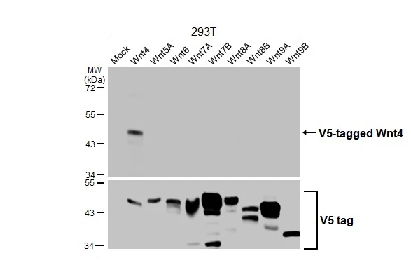 Non-transfected and transfected 293T whole cell extracts were separated by 10% SDS-PAGE, and the membrane was blotted with Wnt4 antibody (GTX101085) diluted at 1:5000. The HRP-conjugated anti-rabbit IgG antibody (GTX213110-01) was used to detect the primary antibody.