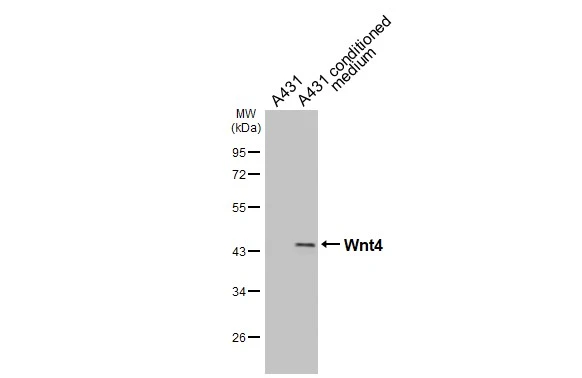 A431 whole cell extract and conditioned medium (30 μg) were separated by 10% SDS-PAGE, and the membrane was blotted with Wnt4 antibody (GTX101085) diluted at 1:1000. The HRP-conjugated anti-rabbit IgG antibody (GTX213110-01) was used to detect the primary antibody.