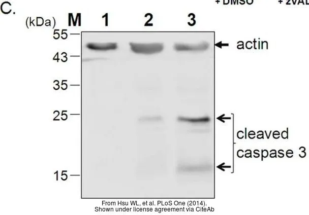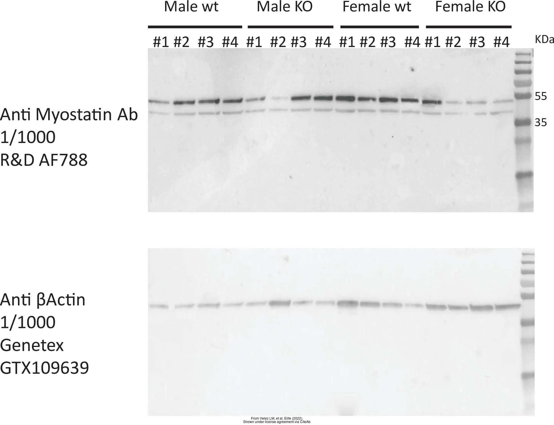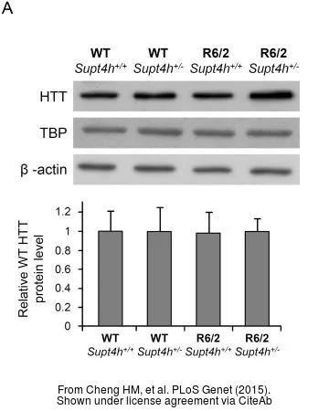 Non-transfected (–) and transfected (+) 293T whole cell extracts (10 μg) were separated by 10% SDS-PAGE, and the membrane was blotted with beta Actin antibody (GTX109639) diluted at 1:15000. The HRP-conjugated anti-rabbit IgG antibody (GTX213110-01) was used to detect the primary antibody.