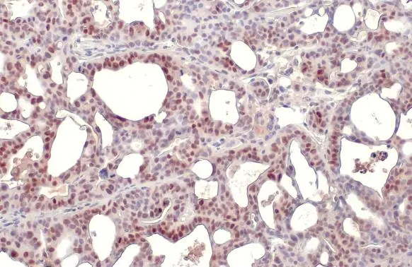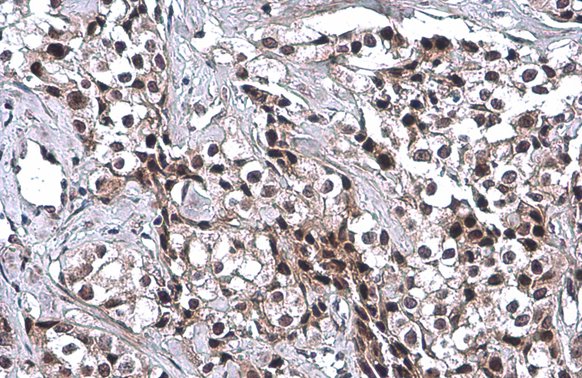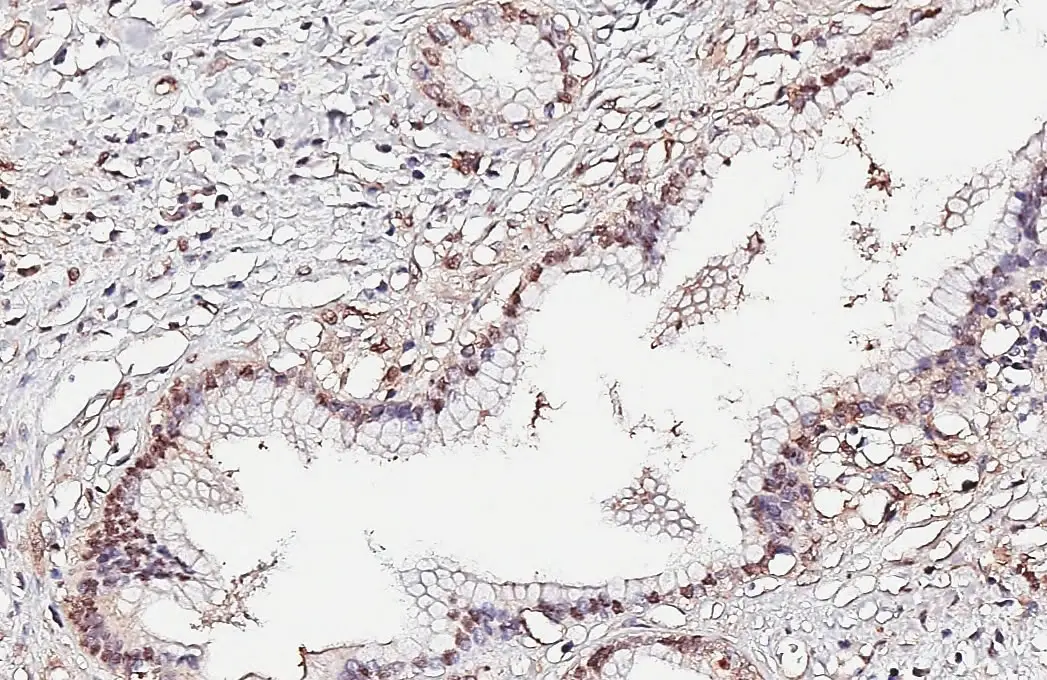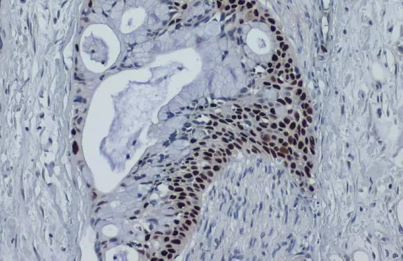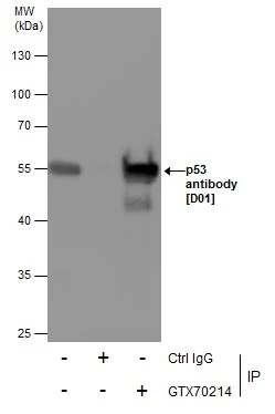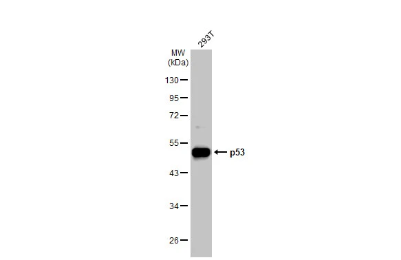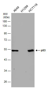 p53 antibody recognizes p53 protein, which has a predicted molecular weight of 44 kDa but is typically detected by western blot at 53 kDa. p53, known widely as a tumor suppressor, plays critical roles in various cellular processes including cell cycle regulation, DNA repair, and apoptosis. p53 is mutated in many human cancers.