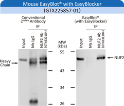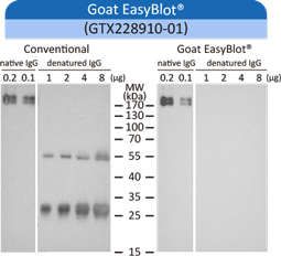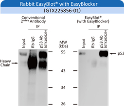 | GeneTex's EasyBlot® secondary antibodies are specifically optimized to eliminate this problem. They bind only the native (non-denatured and non-reduced) primary antibody used for WB analysis and not the denatured IP antibody chains. In addition, the specially formulated EasyBlocker reagent will greatly reduce background signal caused by free Protein A or Protein G. |