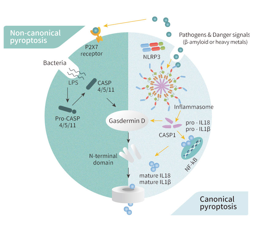 细胞焦亡是一种由典型或非典型机制启动,并由炎性胱天蛋白酶(caspases)执行的程序性细胞死亡的过程,它由不同于细胞凋亡 (apoptosis)的特定炎性胱天蛋白酶(caspases-1, -4, -5, -11)触发,典型和非典型途径均导致gasdermin D (GSDMD)的活化,从而形成导致细胞渗漏和裂解的孔洞,典型顺序涉及病原相关分子模式(PAMPs)和损伤相关分子模式(DAMPs)介导的炎性小体形成,导致caspases-1激活、GSDMD裂解,IL-1β和IL-18成熟,非典型途径的特征在于其他三个胱天蛋白酶与革兰氏阴性细菌脂多醣(LPS)的直接相互作用以及随后的GSDMD激活,细胞质成分被释放到细胞外导致局部的炎症级联反应,这种炎症级联反应可以变成全身性的,从而突出了细胞焦亡正常功能在调动免疫细胞抵抗病原体方面的重要性,然而,细胞焦亡也可导致与炎症有关的病理,包括癌症进展和自身免疫性疾病