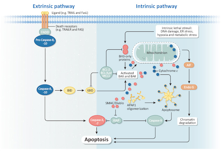 凋亡是程序性细胞死亡,对于发育和组织稳态至关重要,它可以由各种刺激引发,并且可以通过受体介导的外在途径或以线粒体事件开始的内在途径进行,这两个过程都涉及胱天蛋白酶的激活,凋亡细胞的细胞形态发生明显变化,例如细胞变圆、质膜起泡和核碎裂,涉及一系列关键参与者,包括促凋亡基因表达的肿瘤抑制因子p53和FOXO3a等转录因子,效应子(例如Caspase 3和ROCK1),以及在胱天蛋白酶非依赖性途径中起作用的PARP和AIF等因子。 |