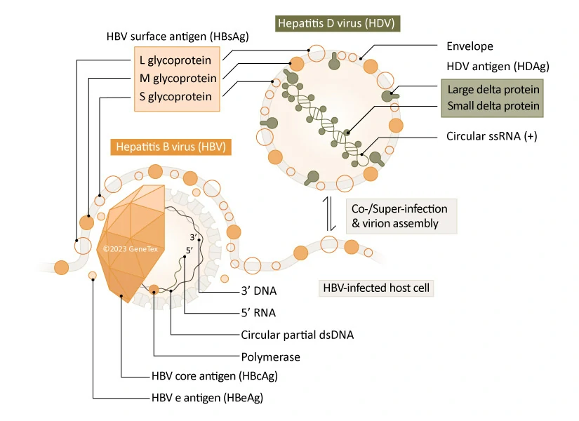 HDV 是一种有缺陷的病毒,只能感染同时感染 HBV 的个体,因为它的包膜中需要 HBsAg 才能进入肝细胞 (1, 2)。 它具有动物病毒中已知最小的基因组,由大约1.7 KB 的环状单链 RNA 组成,唯一编码的蛋白质是 δ 型肝炎抗原 (HDAg),它以两种亚型存在:大 HDAg (L-HDAg (214 a.a.)) 和小 HDAg (S-HDAg (195 a.a.)) (1)。 L-HDAg 包含 S-HDAg 序列以及在病毒颗粒组装过程中将 HDV 核糖核蛋白连接到HBsAg 所需的 C 端异戊二烯基化基序,S-HDAg 对于病毒复制是必需的,而 L-HDAg 具有抑制作用 (1)。 HDV 仅在肝细胞核中复制,并重新分配宿主 RNA 聚合酶 II 复制其基因组,因此,HBsAg 是 HBV 复制 HDV 所必需的(也是唯一的)成分,对于 HDV 感染肝细胞以及病毒组装和病毒粒子释放的能力至关重要 (1, 2)。