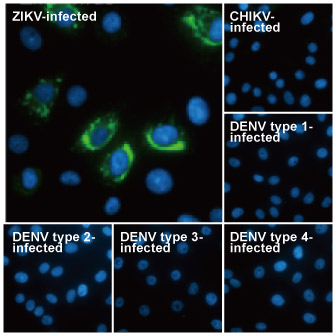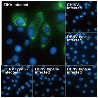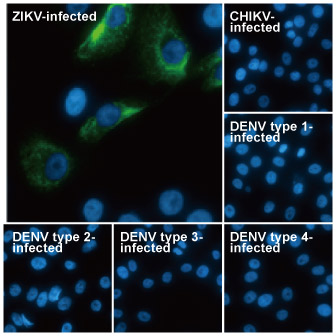 ✔ 通过WB对感染Zika病毒的细胞的裂解物进行验证。 ✔ 可以通过IFA区分寨卡病毒、登革热和基孔肯尼亚病毒。 ✔ 针对不同寨卡病毒蛋白的广泛研究抗体。 |