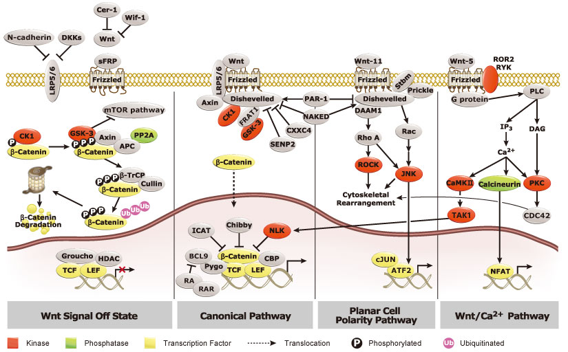 Wnt蛋白是分泌的型态发生因子,是各种发育过程(包括细胞命运决定、细胞增殖和细胞死亡)所必须的,与Frizzled受体结合后,触发了三个途径: 经典途径、平面细胞极性途径和Wnt/Ca2+途径,在经典途径中,主要效应物β-catenin进入细胞核并促进Wnt调控的基因表达,平面细胞极性途径通过启动RhoA和Rac促进细胞骨架重塑和细胞运动,Wnt/Ca2+途径通过增加瞬时Ca2+水平以及随后启动PKC、CAMKII和Calcineurin来介导多种功能,Wnt途径不仅促进包括顶/基极极性和神经管构图等胚胎发生的方面,而且还诱导肿瘤发生,最近还报导了Wnt信号传导调节干细胞分化。