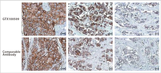 | In another example, slides of human breast carcinoma tissues that express different amounts of HER2/ERBB2 were tested by immunohistochemistry with GeneTex’s HER2/ ERBB2 antibody (GTX100509) and a comparable antibody from another manufacturer. Both antibodies show the expected staining pattern and intensities that correlate with the respective expression levels for each sample. GeneTex antibodies that have been validated using this strategy will be labeled with the icon “  ”  in relevant product pages and marketing materials. |