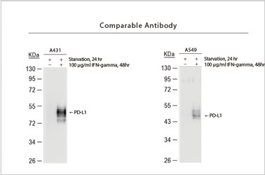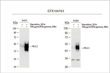 | In this example, A431 and A549 cells were cultured in basal medium for 24 hours followed by treatment with 100 ng/ml IFN-gamma for 48 hours. Whole cell extracts were then subjected to western blot using either GeneTex’s PD-L1 antibody (GTX104763) or a comparable antibody from an independent manufacturer following its recommended dilution factor. The signals were generated using the same HRP-conjugated secondary antibody and development parameters. The results demonstrate a consistent pattern and molecular size, representing PD-L1’s glycosylated form. Interestingly, only GTX104763 detects the unglycosylated PD-L1 in A549 cells (~ 33kDa), which was further confirmed by Tunicamycin treatment (see the GTX104763 data sheet for more information). |