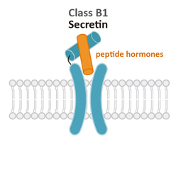 | Class B1 | Secretin (S)    Class B1 (Secretin) GPCRs are characterized by their large extracellular domains (ECDs) that are able to bind large peptidic ligands such as hormones or neuropeptides. |