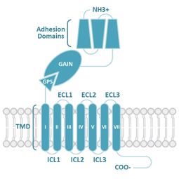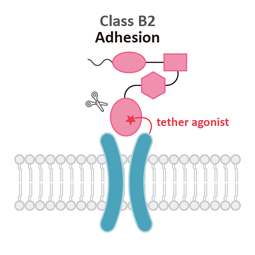 | Class B2 | Adhesion (A)    Similar to Class B1, Class B2 (Adhesion) GPCRs feature a large ECD. Signaling results from the pre-digestion of the GPCR autoproteolysis-inducing (GAIN) domain at the GPCR proteolytic site (GPS) motif. Mechanical force releases the Stachel peptide that then acts as a tethered agonist to bring about 7TM activation.    The individual N-terminal motifs of the subgroups reflect their unique roles in cell adhesion and migration.