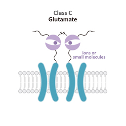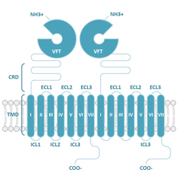 | Class C | Glutamate (G)   Class C (Glutamate) GPCRs are distinctive for large ECDs, which include a Venus Fly Trap (VFT) domain and a cysteine-rich domain (CRD), and their mandatory homo- or heterodimerization. |