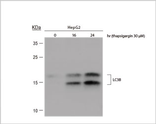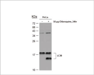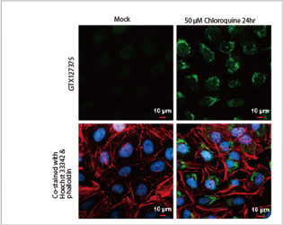 In the example below, LC3B protein expression and subcellular localization were detected by western blot and immunocytochemistry with GeneTex’s LC3B antibody (GTX127375) in HepG2 and HeLa cells treated with Thapsigargin and Chloroquine, respectively. The LC3B signal was found to be both increased and enriched in autophagosomes in the treated cells, corresponding to the protein’s known biological behavior. |