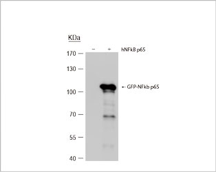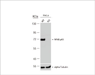 | The validity of a target protein’s endogenous signal can be further substantiated through overexpression of that protein using a recombinant construct. This approach offers supportive evidence verifying antibody performance and gives greater confidence that the detected signal is not artificial. In addition, the overexpression of related proteins allows evaluation of an antibody’s possible cross-reactivity with homologous targets. The following examples show how we use protein overexpression to validate antibody quality. To analyze the specificity of our NF-κB p65 antibody (GTX107678), a western blot was performed on both HeLa wildtype (WT) and CRISPR-generated RELA knockout (KO) lysates. As expected, the NF-κB p65 signal was not present in the KO lysate. Alternatively, lysates from 293T cells that overexpress GFP-tagged NF-κB p65 were examined, and the signal was detected at its predicted molecular weight. The combined data provide both negative and positive controls to validate the same antibody. |