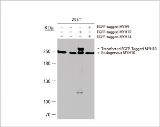 | In another example, to query potential cross-reactivity of our MYH10 antibody (GTX634160) with homologous proteins, lysates from 293T cells expressing either EGFP-tagged MYH9, MYH10, or MYH14 were subjected to western blot. As shown below, the MYH10 antibody (GTX634160) only detected overexpressed MYH10 and not MYH9 and MYH14. Similarly, our IDH2 antibody (GTX133078) only detects IDH2 protein but not IDH1, highlighting the utility of this antibody for studying IDH2-specific biological events. |